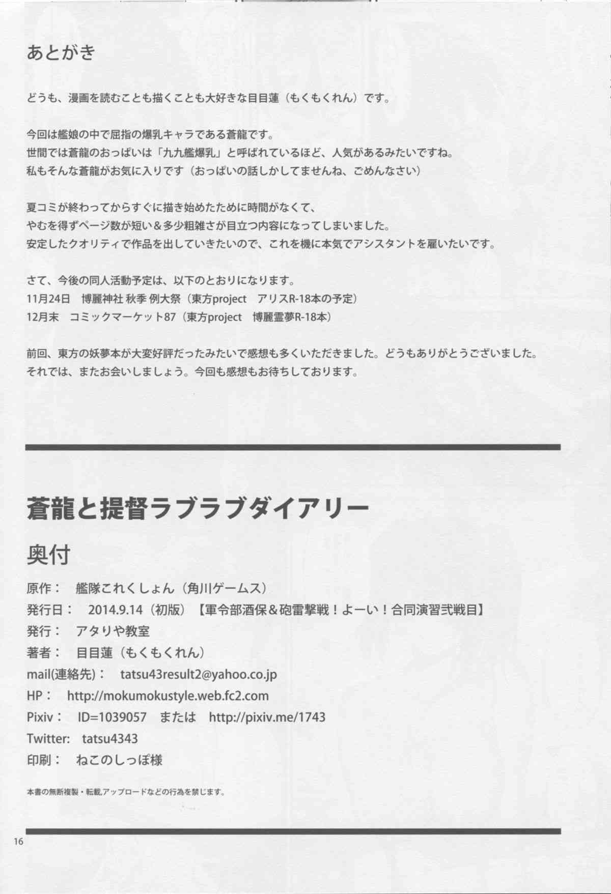 (C86) [アタりや教室 (目目蓮)] 蒼龍と提督ラブラブダイアリー (艦隊これくしょん -艦これ-)Report (C86) [Atariya Kyoushitsu (Mokumokuren)] Souyruu to Teitoku Love Love Diary (Kantai Collection -KanColle-)