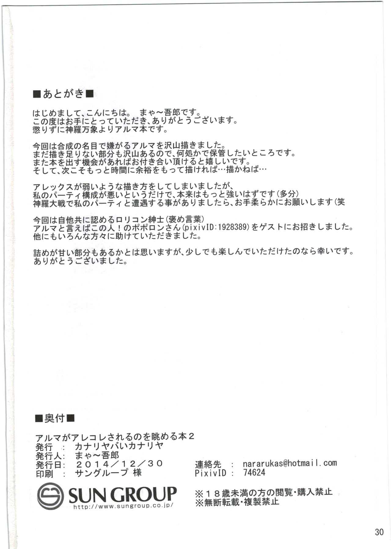 (C87) [カナリヤバいカナリヤ (まゃ~吾郎)] アルマがアレコレされるのを眺める本。2 (神羅万象)Report (C87) [カナリヤバいカナリヤ (まゃ~吾郎)] アルマがアレコレされるのを眺める本。2 (神羅万象)