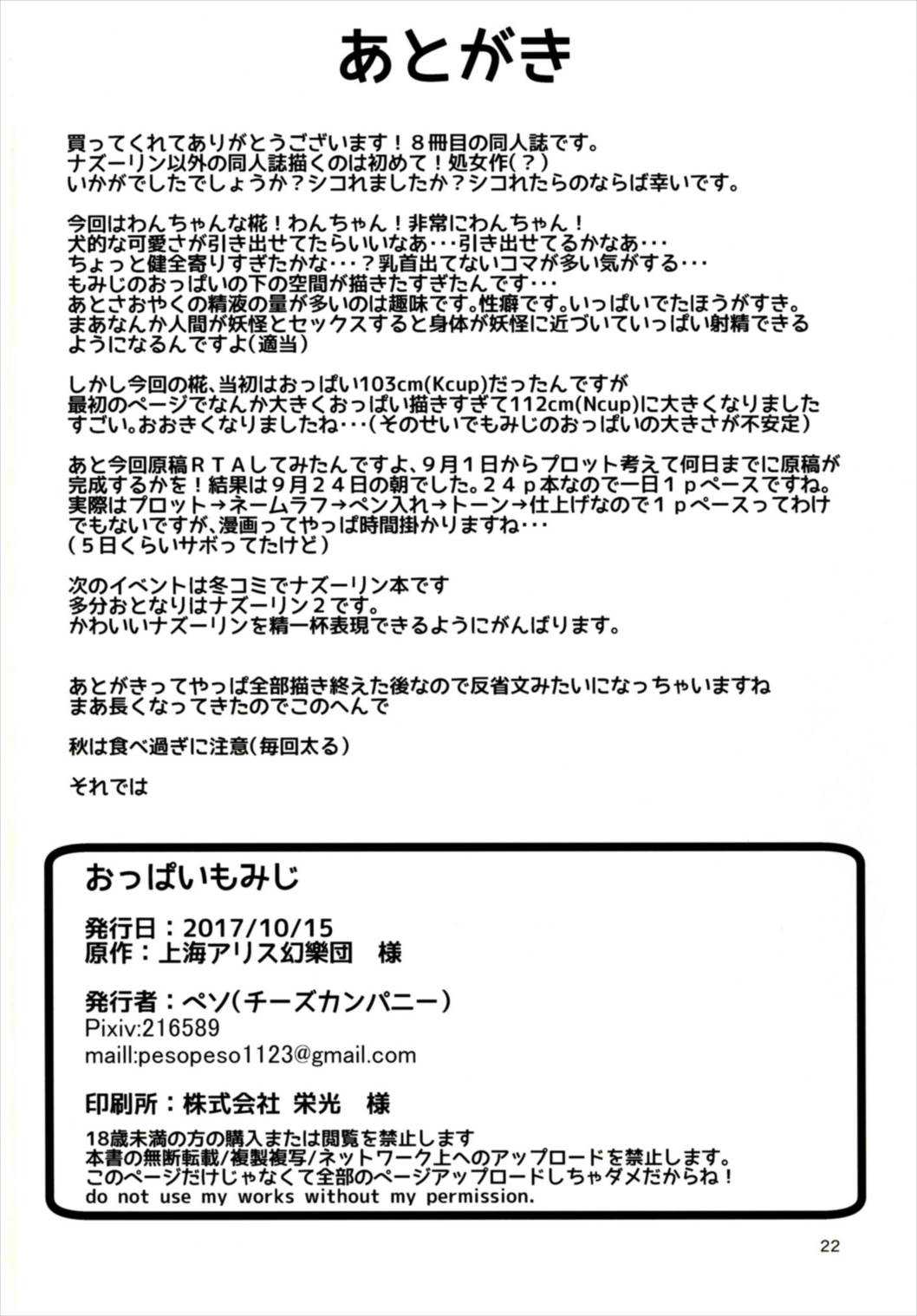 (秋季例大祭4) [チーズカンパニー (ペソ)] おっぱいもみじ (東方Project)Report (Shuuki Reitaisai 4) [Cheese Company (Peso)] Oppai Momiji (Touhou Project)