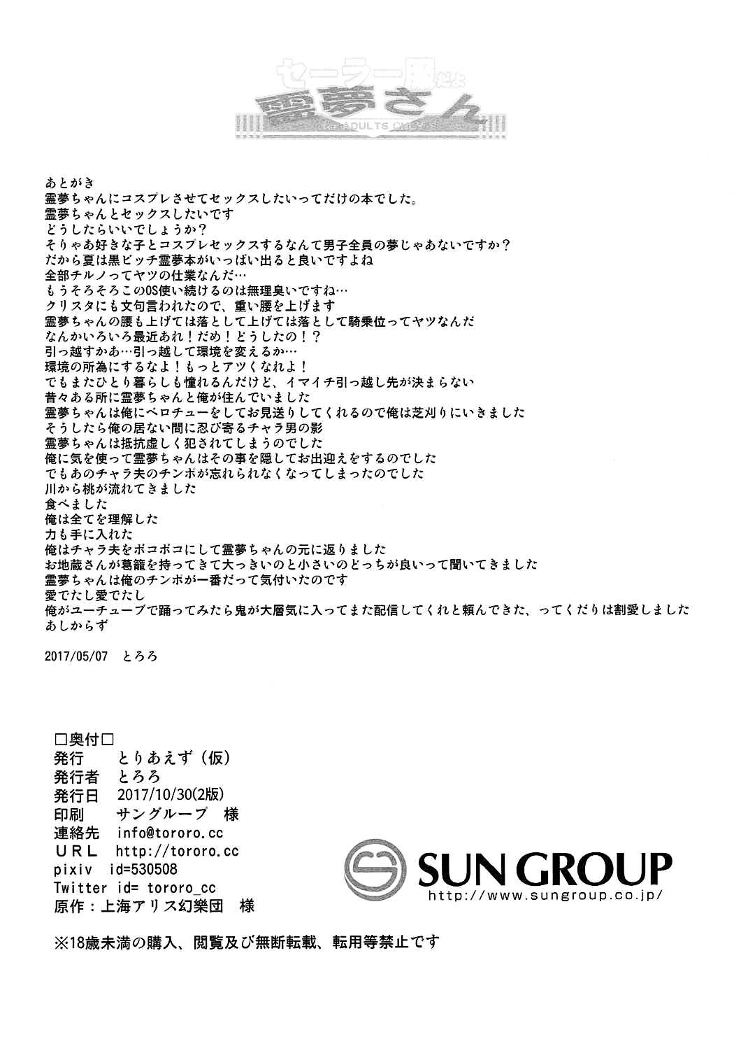(例大祭14) [とりあえず(仮) (とろろ)] セーラー服だよ霊夢さん (東方Project) [中国翻訳]Report (Reitaisai 14) [Toriaezu(kari) (Tororo)] Sailor Fuku da yo Reimu-san (Touhou Project) [Chinese] [oo君個人漢化]