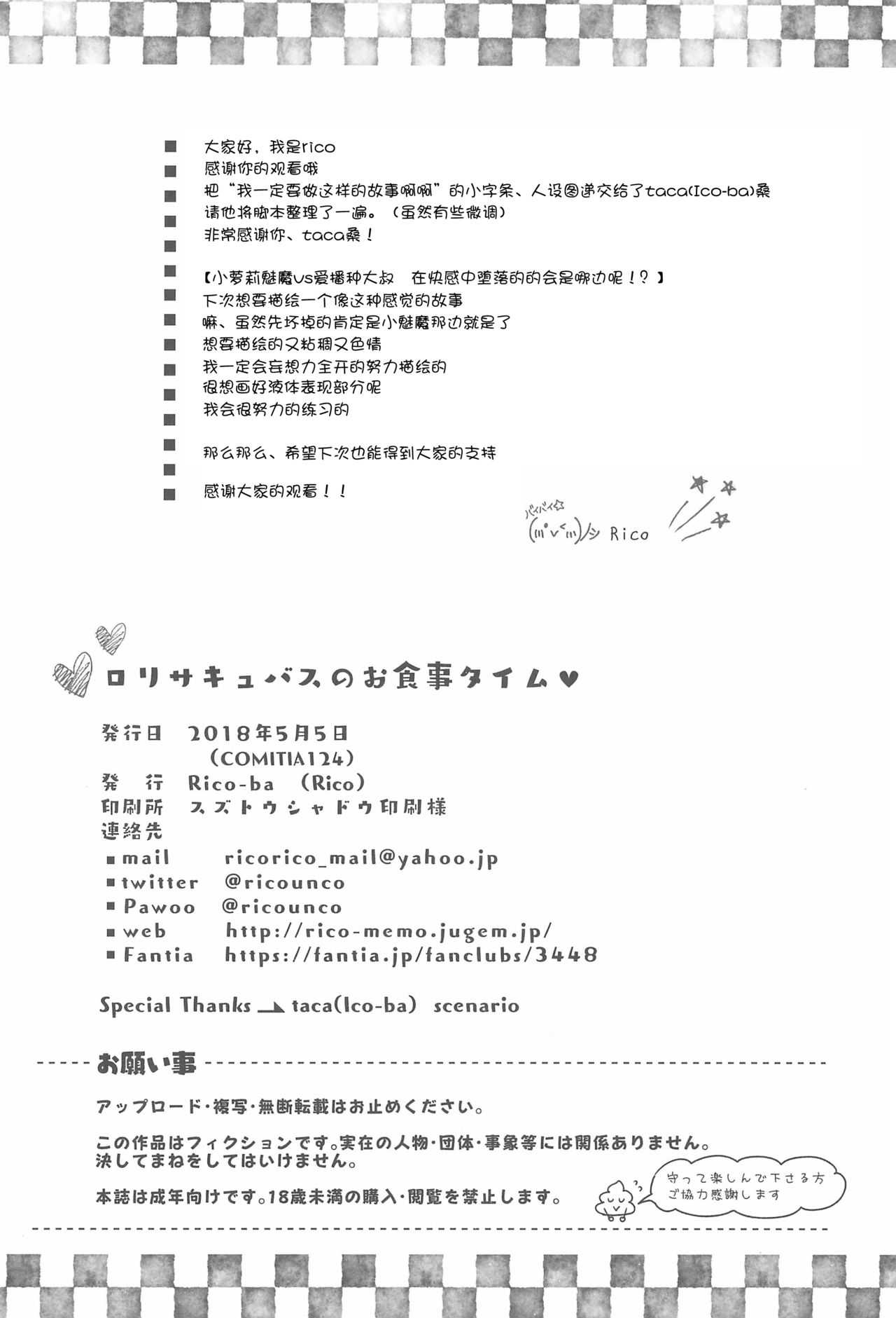 (コミティア124) [Rico-ba (Rico)] ロリサキュバスのお食事タイム [中国翻訳]Report (COMITIA124) [Rico-ba (Rico)] Loli Succubus no Oshokuji Time [Chinese] [脸肿汉化组]