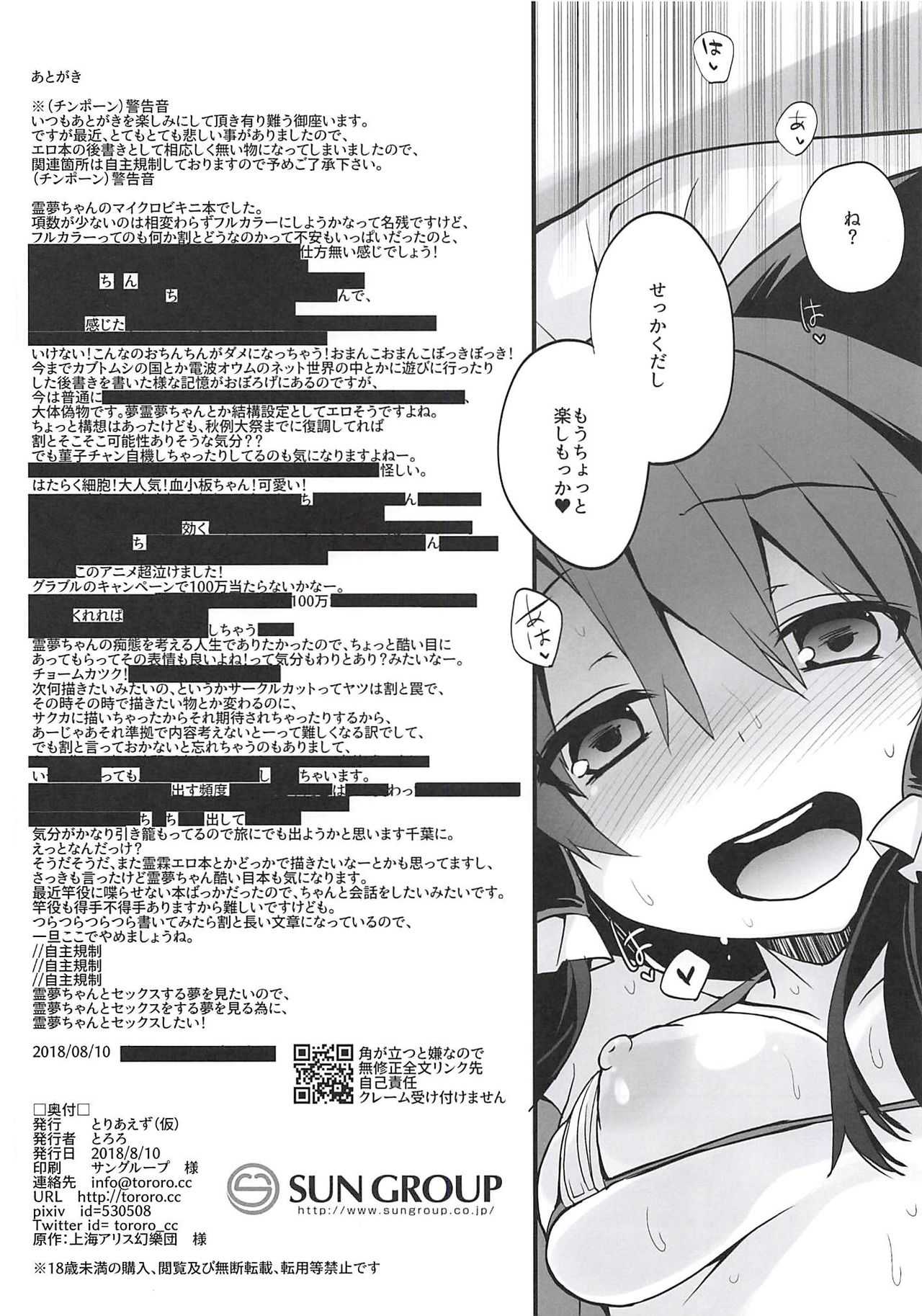 (C94) [とりあえず(仮) (とろろ)] 霊夢さんとマイクロビキニセックス (東方Project)Report (C94) [Toriaezu(kari) (Tororo)] Reimu-san to Micro Bikini Sex (Touhou Project)