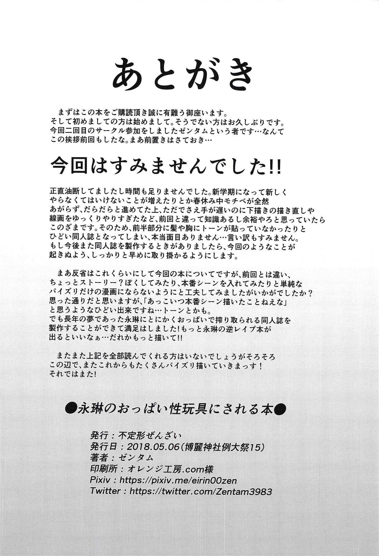 (例大祭15) [不定形ぜんざい (ゼンタム)] 永琳のおっぱい性玩具にされる本 (東方Project)Report (Reitaisai 15) [Futeikei Zenzai (Zentam)] Eirin no Oppai Seigangu ni Sareru Hon (Touhou Project)