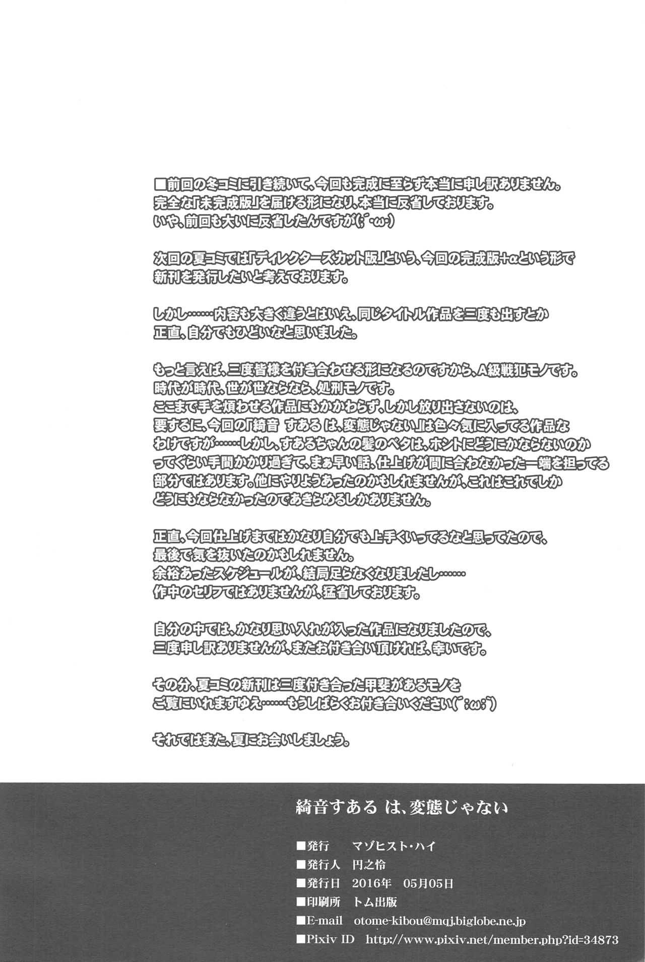 (コミティア116) [マゾヒスト・ハイ (円之怜)] 綺音すあるは、変態じゃないReport (COMITIA116) [Masochist High (Ennorei)] Ayane Suaru wa, Hentai ja Nai