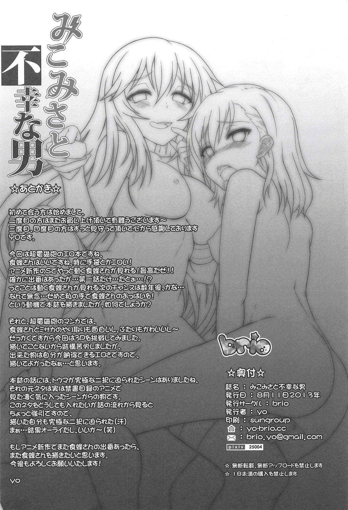 (C84) [BRIO (YO)] みこみさと不幸な男 (とある科学の超電磁砲) [中国翻訳] [無修正]Report (C84) [BRIO (YO)] MikoMisa to Fukou na Otoko (Toaru Kagaku no Railgun) [Chinese] [OBRW个人汉化] [Decensored]