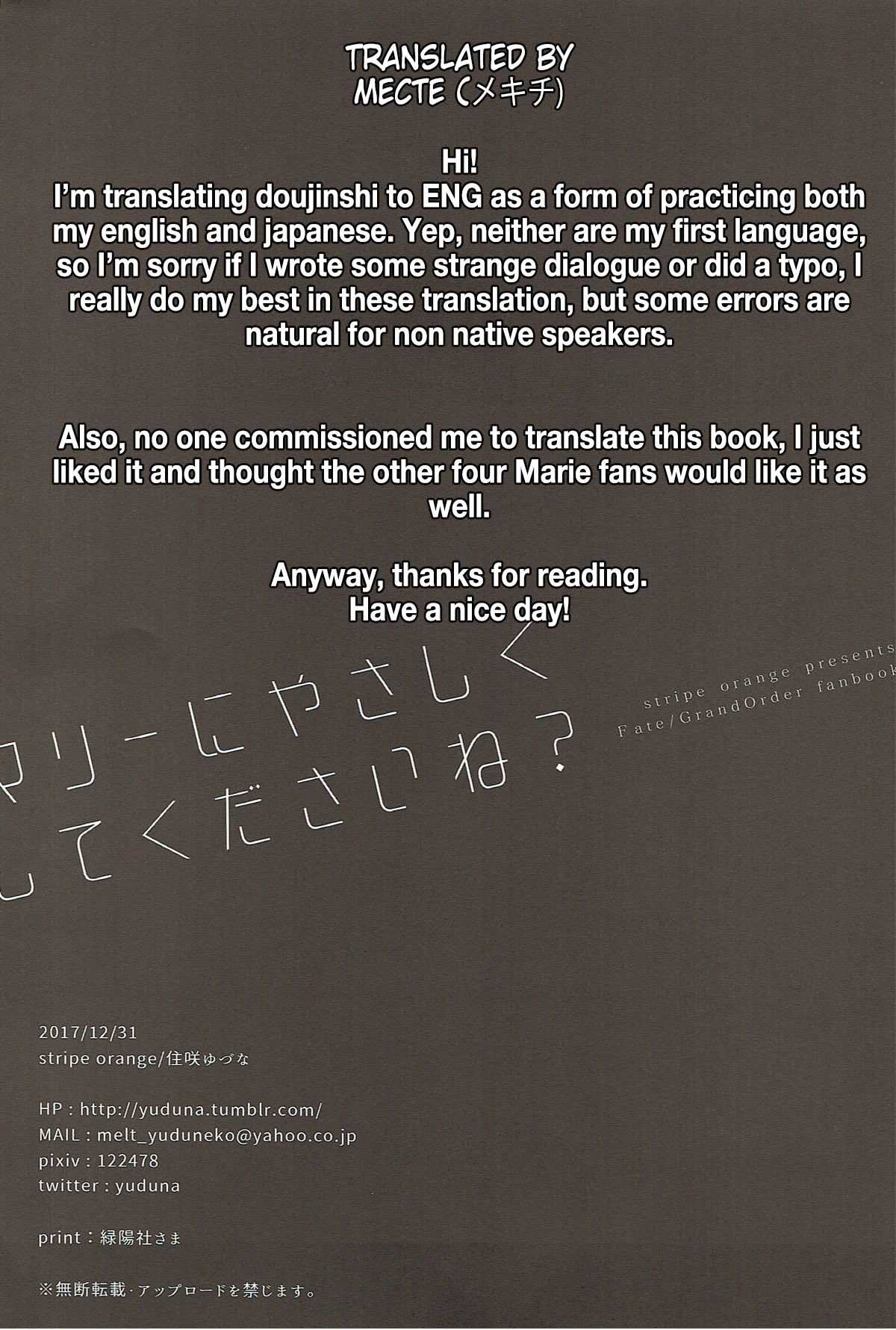(C93) [stripe orange (住咲ゆづな)] マリーにやさしくしてくださいね? (Fate/Grand Order) [英訳]Report (C93) [stripe orange (Sumisaki Yuduna)] Marie ni Yasashiku Shite Kudasai ne? | Please, Be Kind With Me, Okay? (Fate/Grand Order) [English] [Mecte]