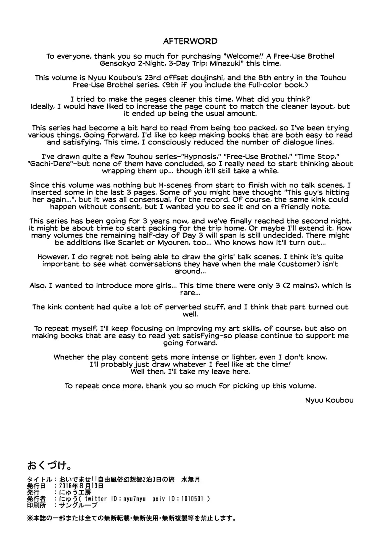 [にゅう工房 (にゅう)] おいでませ!!自由風俗幻想郷2泊3日の旅 水無月 (東方Project) [英訳] [DL版]Report [Nyuu Koubou (Nyuu)] Oidemase!! Jiyuu Fuuzoku Gensoukyou 2-haku 3-kka no Tabi - Minazuki (Touhou Project) [English] [CulturedCommissions] [Digital]