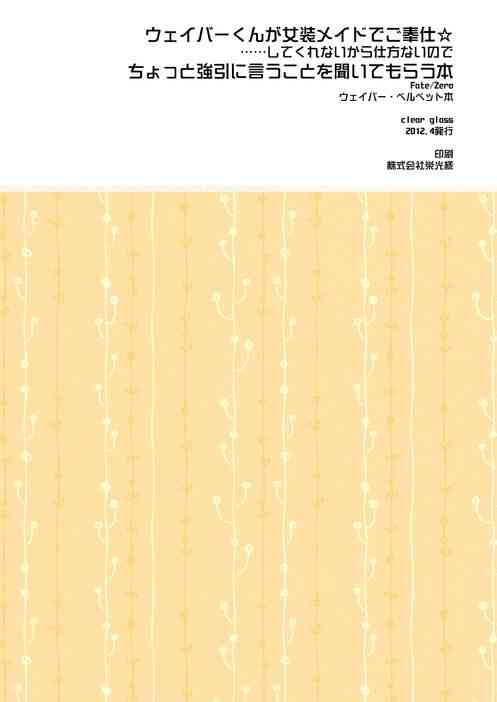 [Clear Glass] ウェイバーくんが女装メイドでご奉仕☆ ……してくれないから仕方がないのでちょっと強引に言うことを聞いてもらう本 (Fate/Zero)Report [Clear Glass] Waver kun ga Josou Maid de Gohoushi ... Shitekurenai kara Shikatanai node Chotto Gouin ni Iukoto wo Kiitemorau Hon (Fate/Zero)